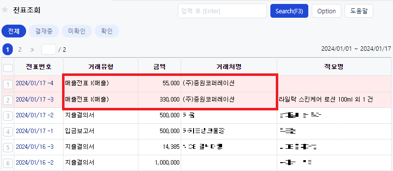 아래화면의 붉은색 음영은 전표 별로 구분하기 위해 반복적으로 나타나는 UI 이므로 무시하셔도 됩니다.
