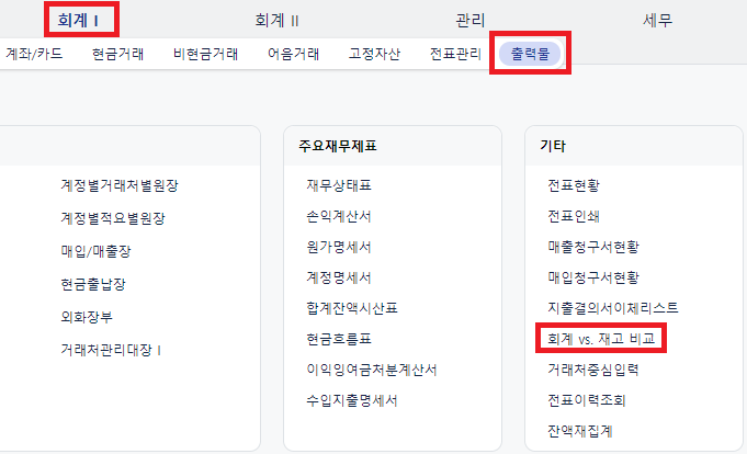 따라서 이번 글에서는 한 달 업무가 끝난 후 마감 시 회계vs재고 메뉴를 사용하여 손쉽게 불일치하는 내역을 정리하는 순서에 대해 설명 드리도록 하겠습니다.