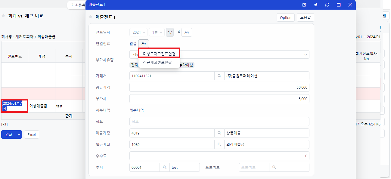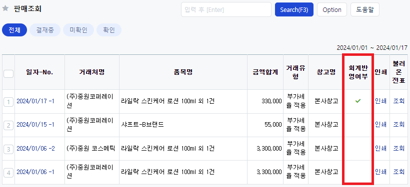 - 회계거래처 : 위 판매조회에서 회계반영이 누락된 거래처 한 군데를 선택